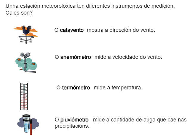 - Diferenza entre tempo e clima: En Baiona e nas illas Canarias pode facer o mesmo tempo (P.ex.: chuvioso, frío, soleado,...), pero iso non quere dicir que teñan o mesmo clima (Baiona: temperado oceánico; illas Canarias: subtropical)
